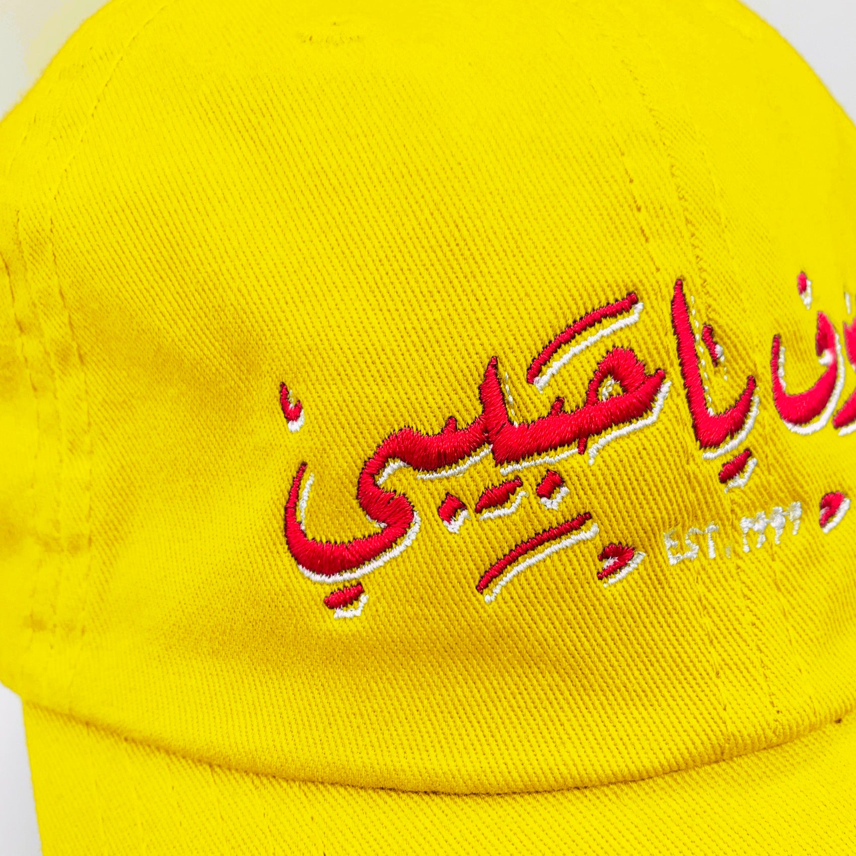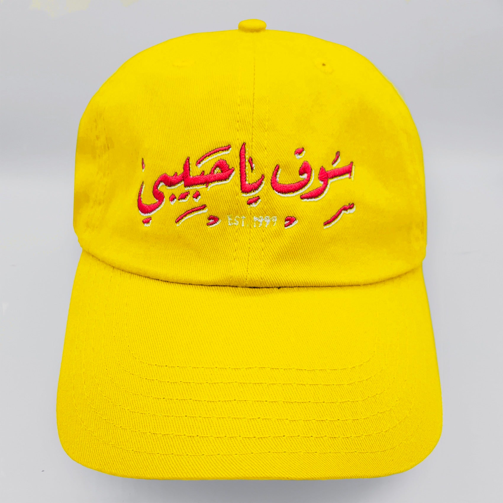 Ya Habibi Market dad Hat in bright yellow, features red and white embroidery detailing. Fabricated in cotton twill, this cap has an adjustable strap with metal buckle at rear.
